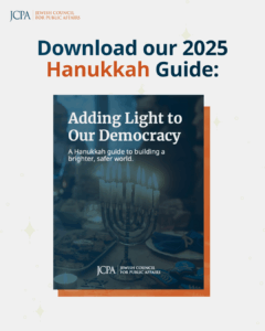 This Hanukkah, JCPA has released a holiday guide exploring the act of lighting candles as a call to action. As darkness grows, we add light — reminding us that Jewish safety is inseparable from inclusive democracy and the safety of all communities. The guide invites reflection and action to help build a brighter, safer world.